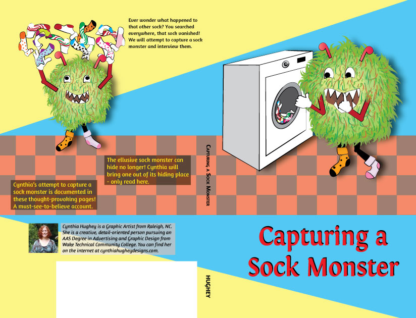 Our assignment in Graphic Design III was to create a book cover and have the inside pages blank. The book should be about something that will make sense to have blank pages. I chose the elusive sock monster! I’m sure everyone has lost socks while doing laundry – where the heck to they go?